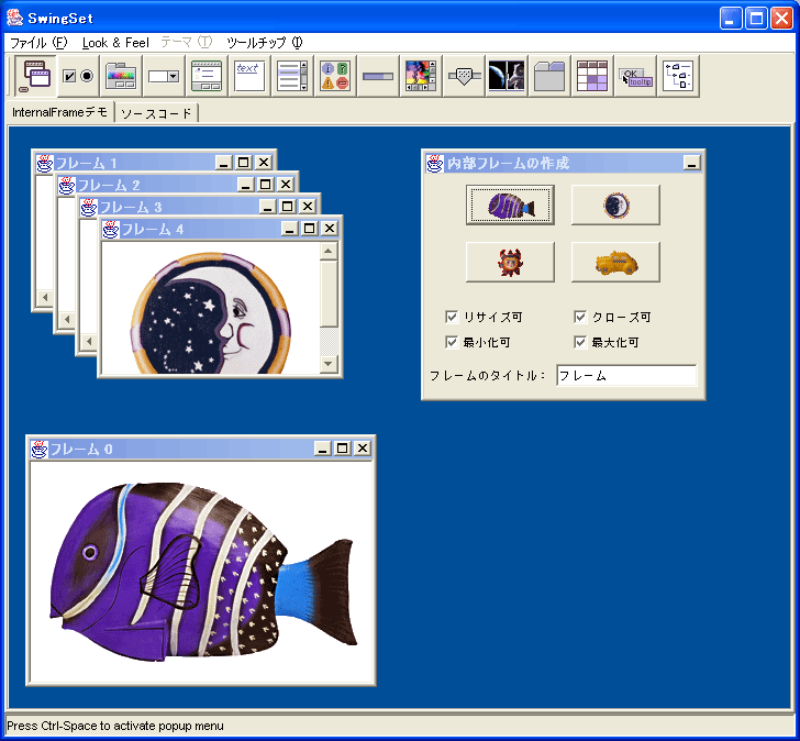 ところで、Windows XP はクラシックスタイルが選べるので、以前の GUI が好みの方はこちらを使っていると思います。こういう場合、Swing もクラシックスタイルに戻しましょう。それにはオプションで -Dswing.noxp=true を指定します。 例えば、SwingSet2 であれば java -Dswing.noxp=true SwingSet2 とします。こうすると、こんな感じになりました。